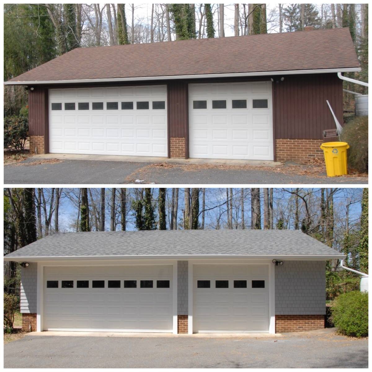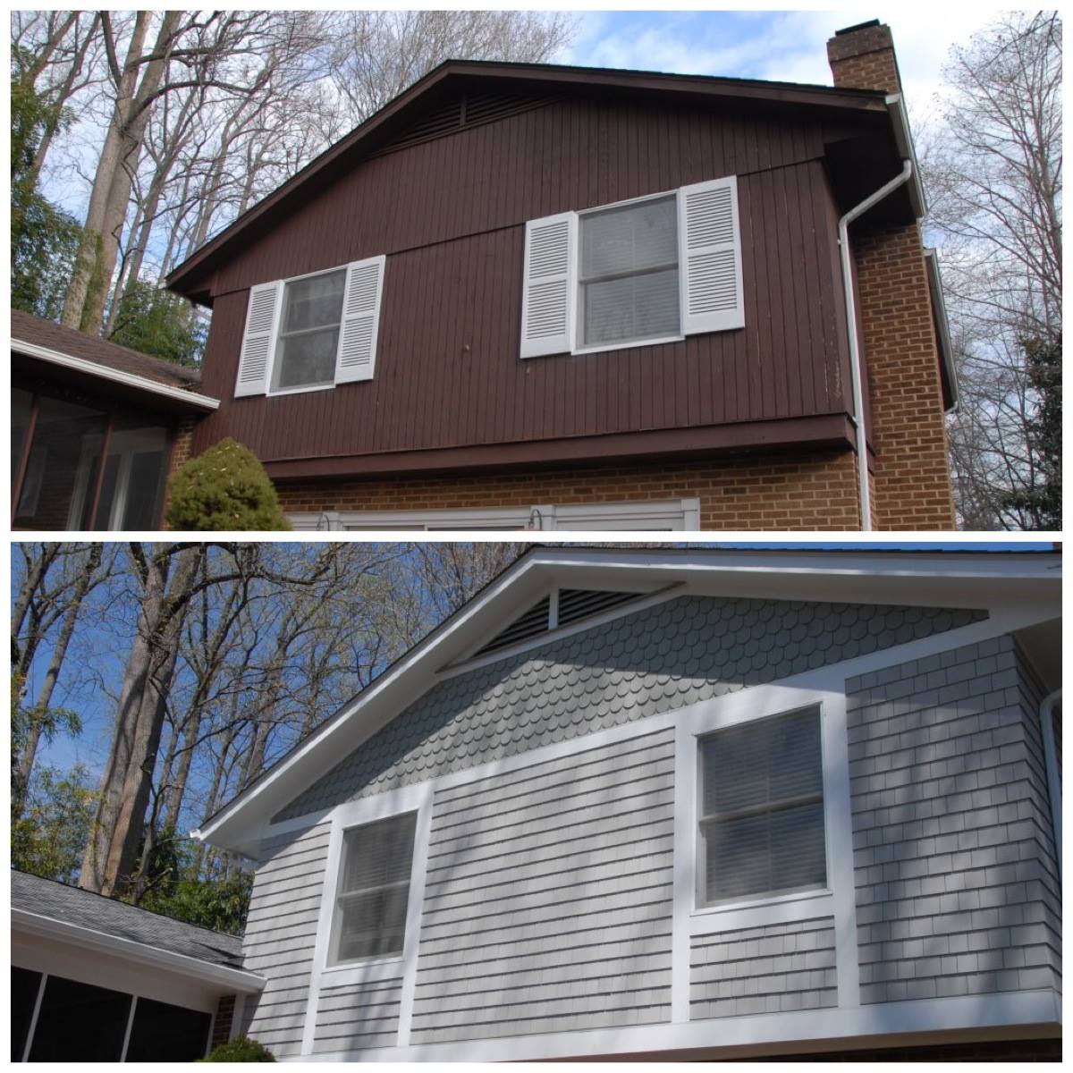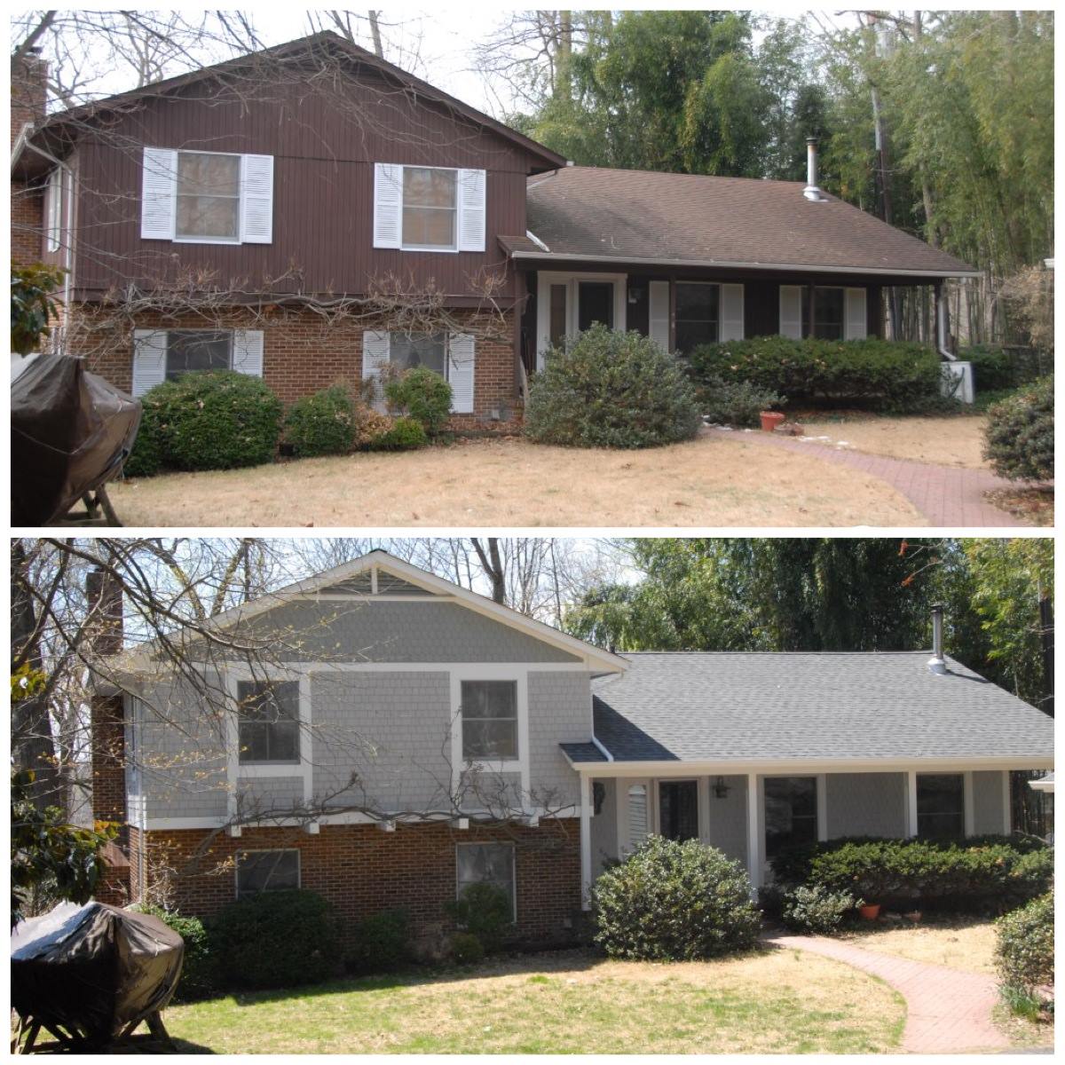 We recently finished a complete exterior makeover on this Crownsville waterfront home and detached garage. The home started out with old brown T-111 siding, outdated white shutters and a drab, stained roof. We started at the top and worked our way down, completely changing the look of this diamond in the rough.